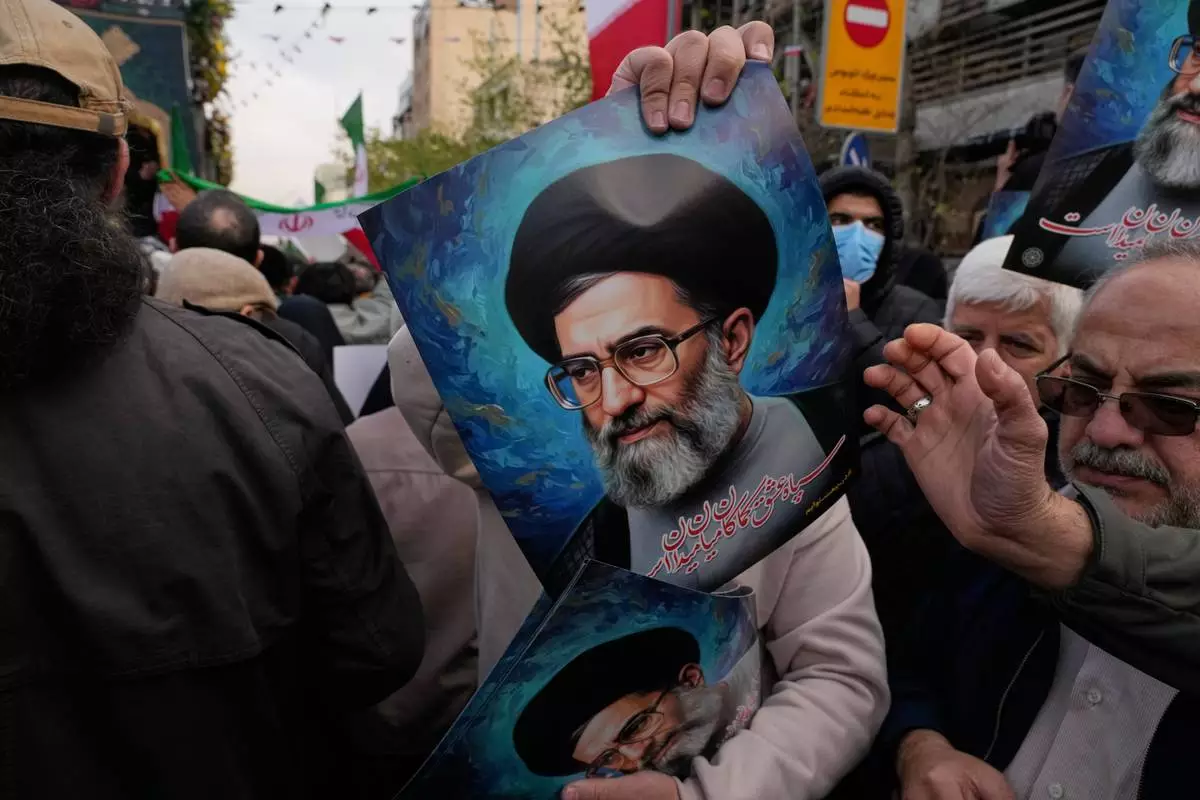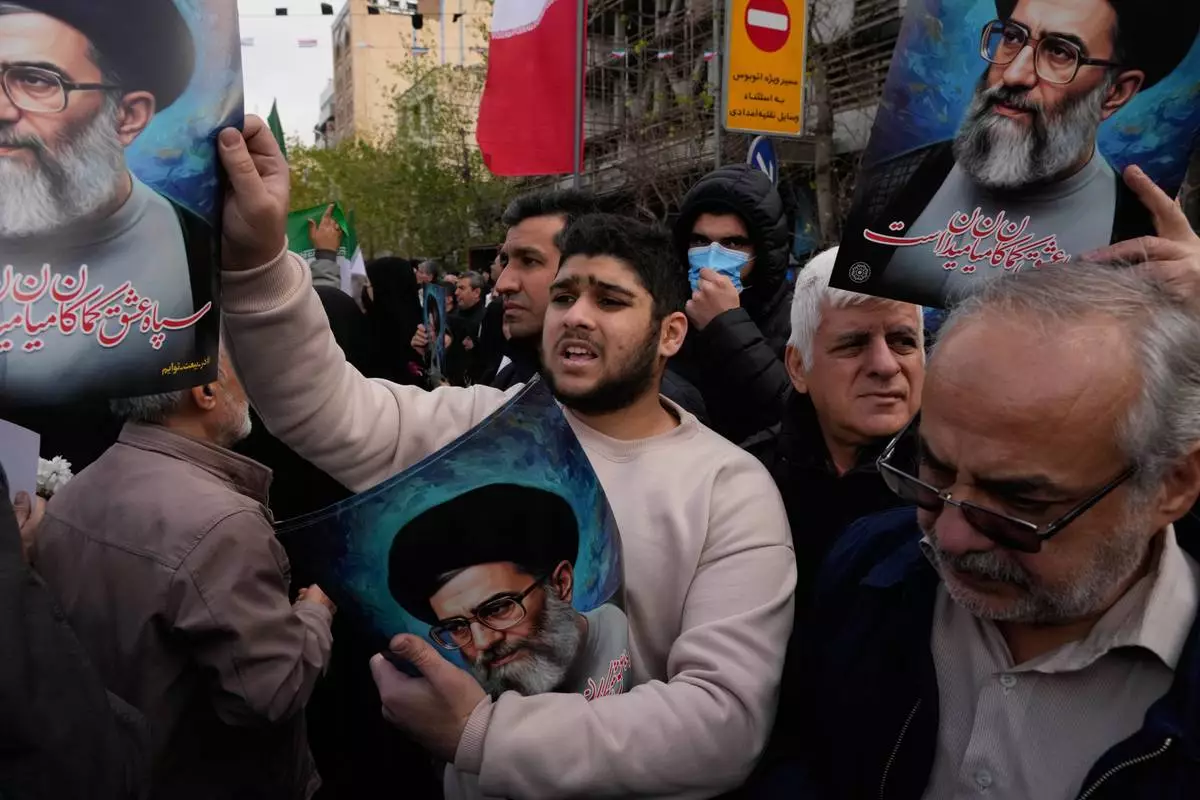 People hold posters of the Iranian Supreme Leader Ayatollah Ali Khamenei during a funeral ceremony for a group of security forces, who were killed during anti-government protests, in Tehran, Iran, Wednesday, Jan. 14, 2026. (AP Photo/Vahid Salemi)