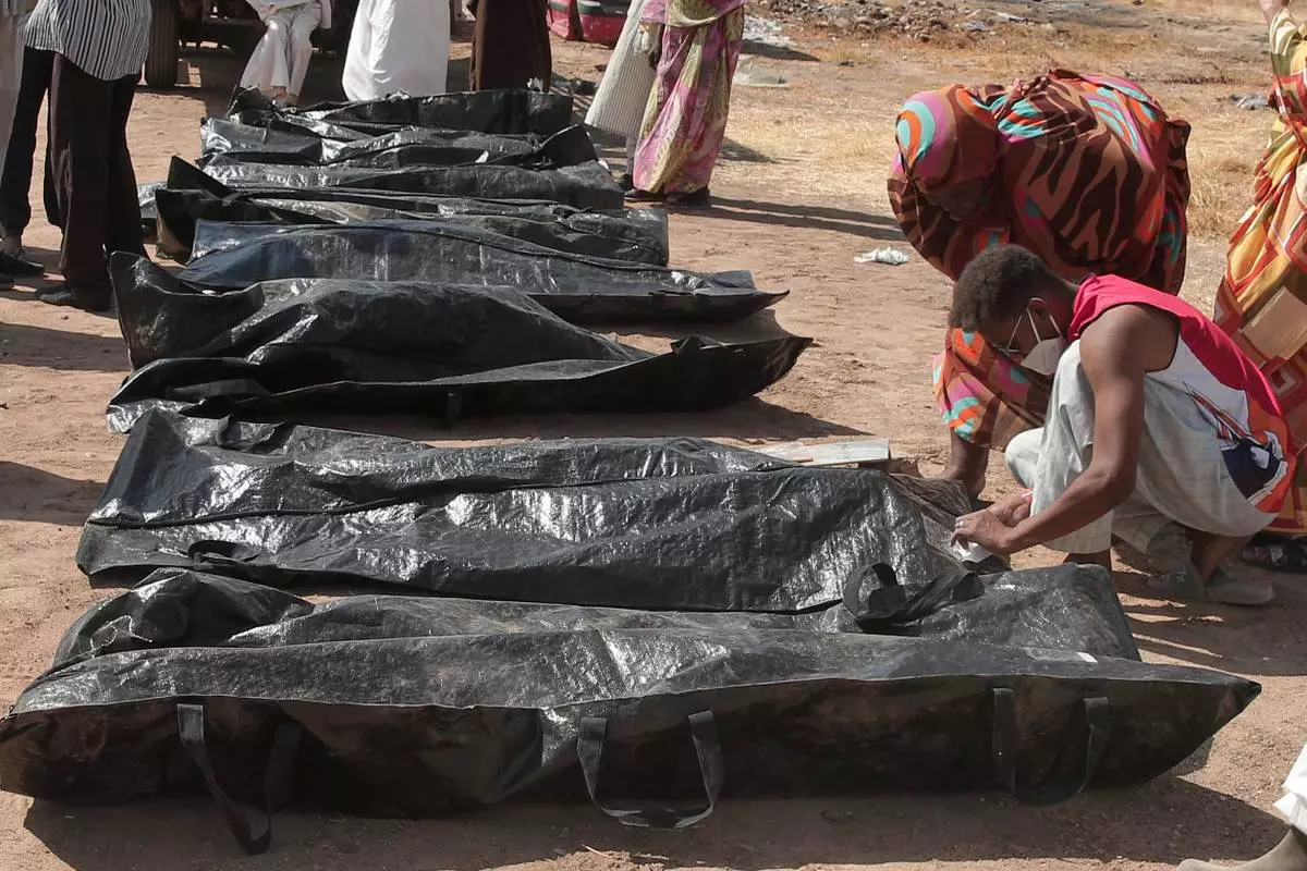 Relatives check names on body bags of victims of Sudan’s two-year conflict after the Sudanese Red Crescent transferred the remains from makeshift graves to a local cemetery in Khartoum, Sudan, Sunday, Jan. 11, 2026. (AP Photo/Marwan Ali)