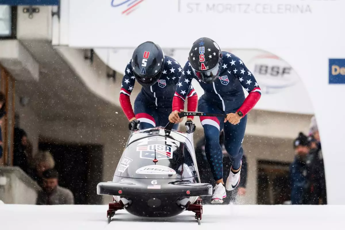 Elana Meyers Taylor/Jadin O'Brien of the USA in action during the Women's 2-Bob World Cup, in St. Moritz, Switzerland, Sunday, Jan. 11, 2026. (Mayk Wendt/Keystone via AP)