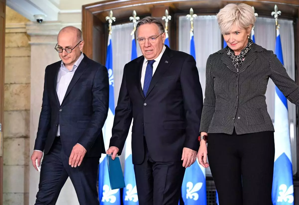Quebec Premier Francois Legault, accompanied by his chief of staff Martin Koskinen, left, and wife Isabelle Brais, right, walk to a news conference to announce his resignation in Quebec City, on Wednesday, Jan. 14, 2026. (Jacques Boissinot/The Canadian Press via AP)
