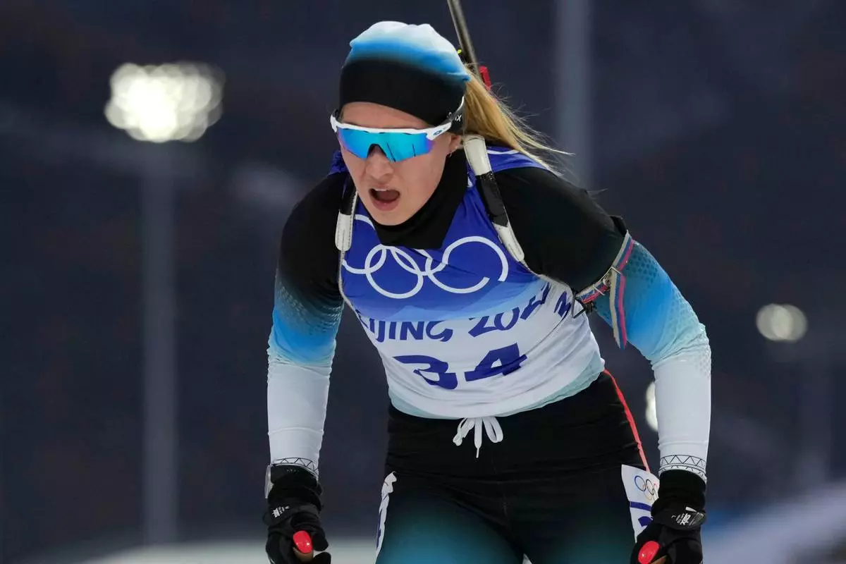 FILE - Ukaleq Astri Slettemark, of Greenland, competes in the Women 15 km Individual event at the Biathlon World Championships in Oberhof, Germany, Feb. 15, 2023. (AP Photo/Matthias Schrader, File)