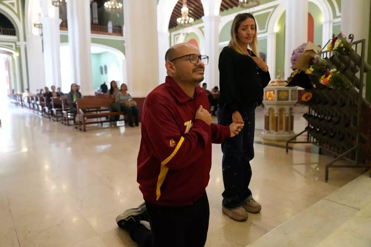 Carlos Rojas, a journalist freed after 18 months in jail, prays with his partner, Francy Fernandez, on the day of his release from prison at La Candelaria Church in Caracas, Venezuela, Wednesday, Jan. 14, 2026. (AP Photo/Ariana Cubillos)
