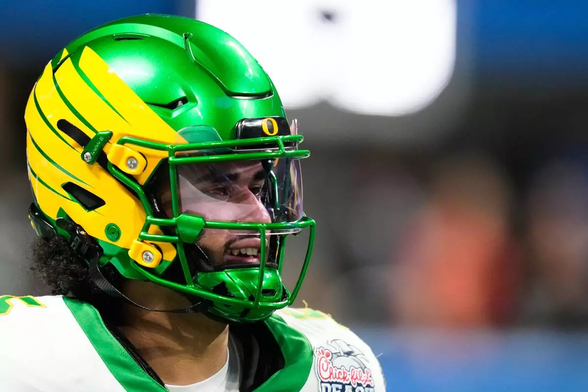 Oregon quarterback Dante Moore warms up before the Peach Bowl NCAA college football playoff semifinal against Indiana, Friday, Jan. 9, 2026, in Atlanta. (AP Photo/Brynn Anderson)