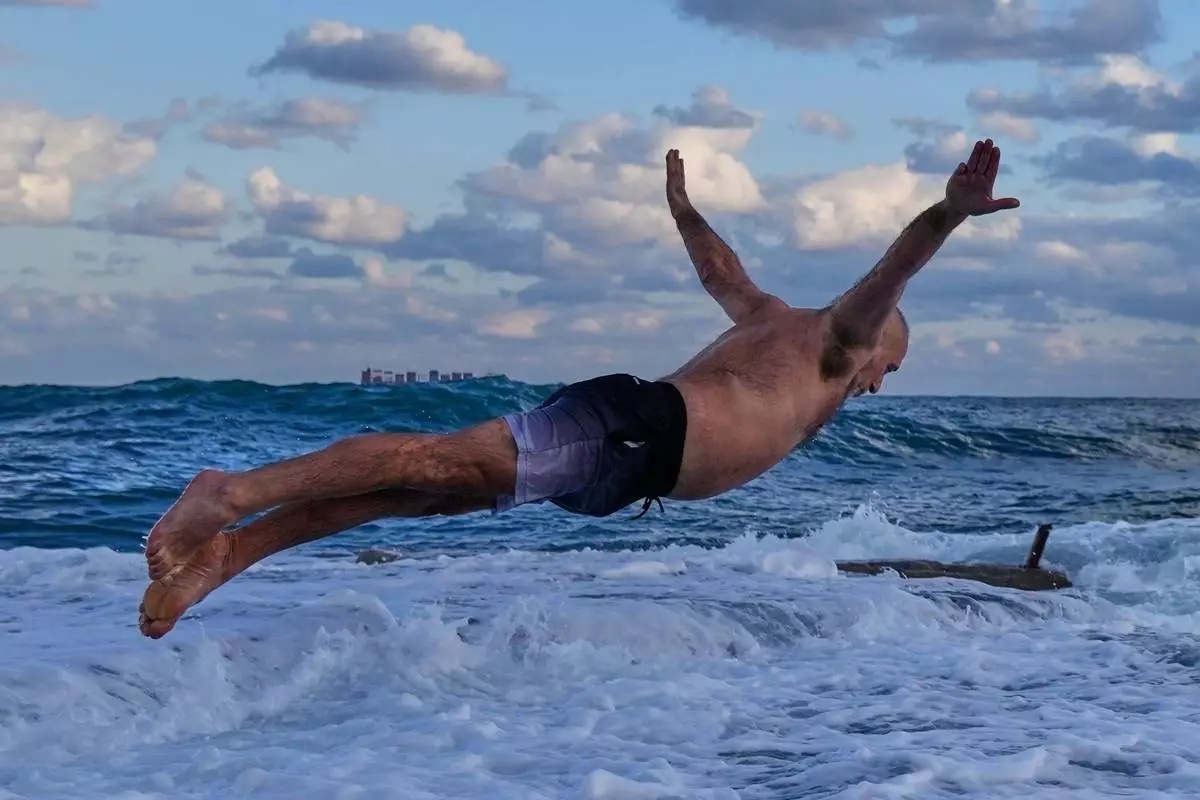 A man jumps into the Mediterranean Sea during an early morning swim as temperatures hovered around 10 degrees Celsius, 50 degrees Fahrenheit, in Beirut, Lebanon, Wednesday, Jan. 14, 2026. (AP Photo/Hassan Ammar)