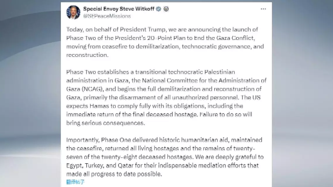 "Today, on behalf of President Trump, we are announcing the launch of Phase Two of the President's 20-Point Plan to End the Gaza Conflict, moving from ceasefire to demilitarization, technocratic governance, and reconstruction," U.S. presidential special envoy Steve Witkoff posted on social media platform X.