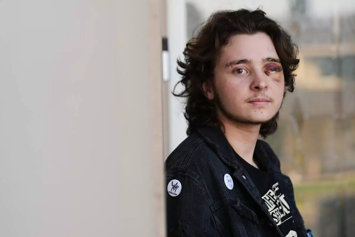 Kaden Rummler, who was injured after being hit with a projectile fired by a federal agent during a protest outside an immigration building in Santa Ana, Calif., poses for a portrait Wednesday, Jan. 14, 2026, in Southern California. (AP Photo/Damian Dovarganes)