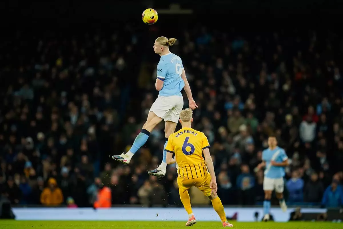 Manchester City's Erling Haaland, top, heads the ball past Brighton's Jan Paul van Hecke during the English Premier League soccer match between Manchester City and Brighton and Hove Albion in Manchester, England, Wednesday, Jan. 7, 2026. (AP Photo/Dave Thompson)
