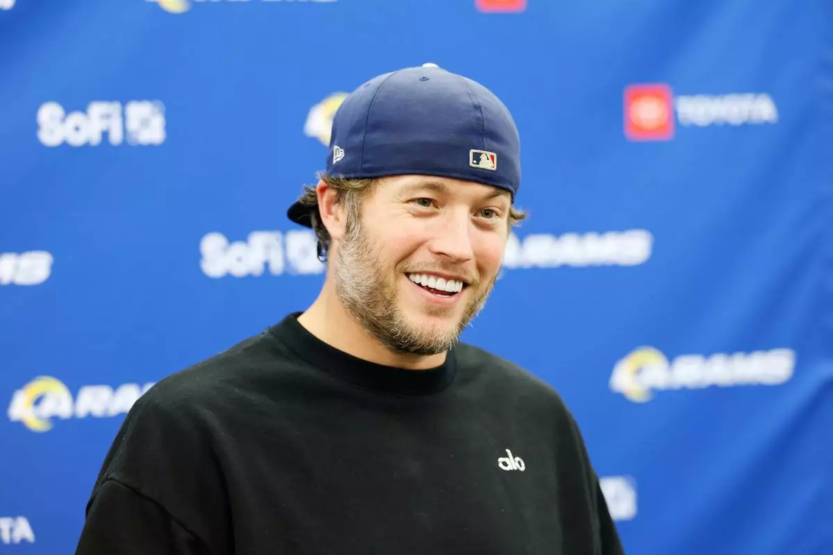 Los Angeles Rams quarterback Matthew Stafford answers question after an NFL wild-card playoff football game against the Carolina Panthers, Saturday, Jan. 10, 2026, in Charlotte, N.C. (AP Photo/Rusty Jones)