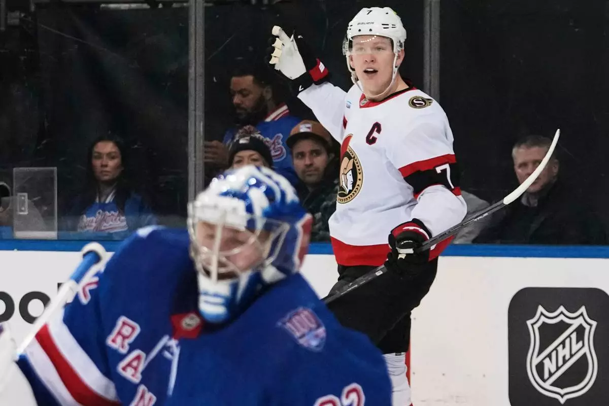 NEW YORK (AP) — Brady Tkachuk scored his 200th regular-season NHL goal and had three assists, and the Ottawa Senators handed the New York Rangers a fifth consecutive loss, beating them 8-4 on Wednesday night.