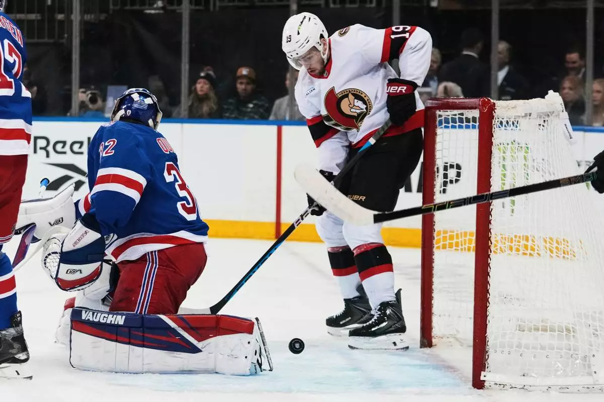 Ottawa Senators' Drake Batherson (19) scores a goal as New York Rangers goaltender Jonathan Quick (32) reacts during the first period of an NHL hockey game Wednesday, Jan. 14, 2026, in New York. (AP Photo/Frank Franklin II)