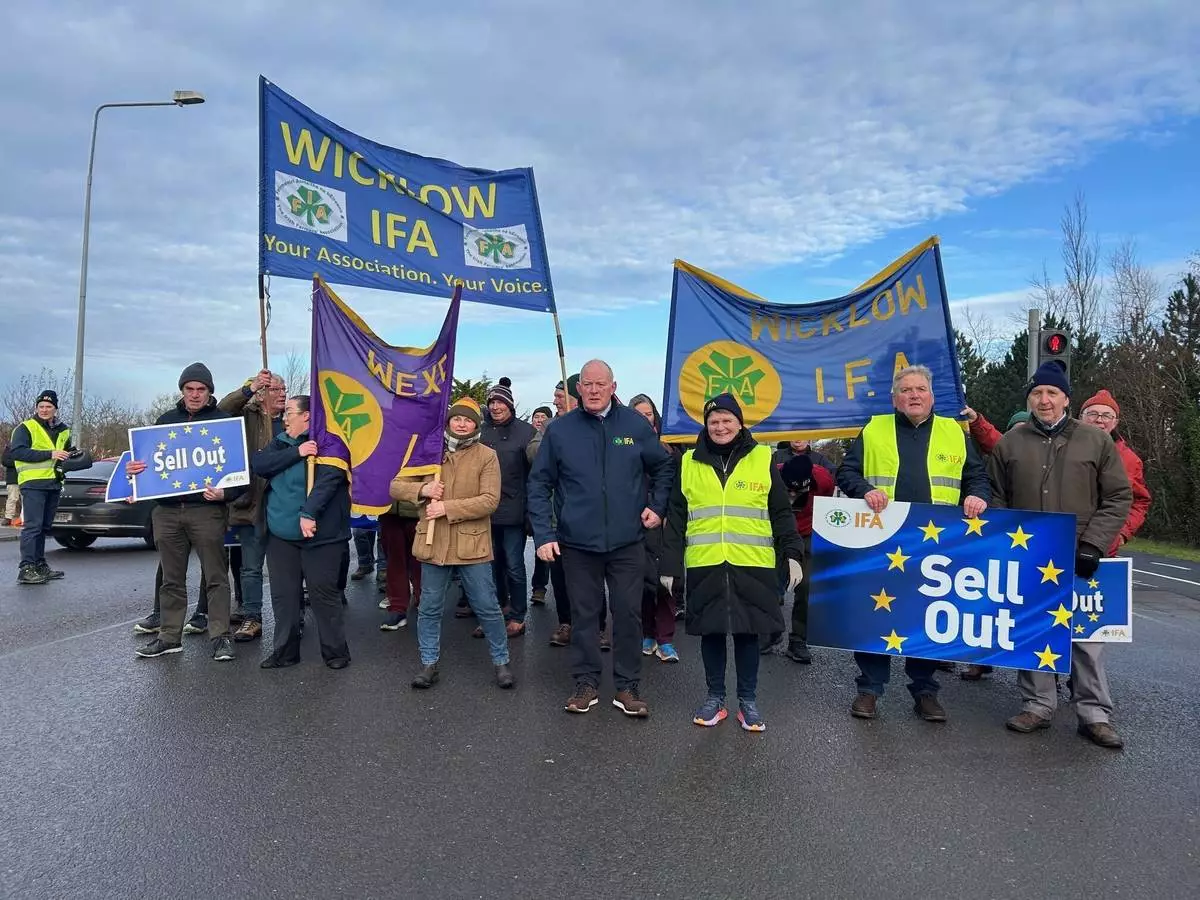 People protest against the EU-Mercosur trade deal in Athlone, Ireland, Saturday Jan. 10, 2026. (Cillian Sherlock/PA via AP)