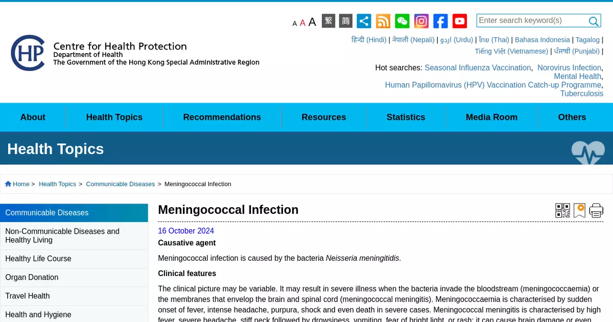 CHP investigates case of invasive meningococcal infection