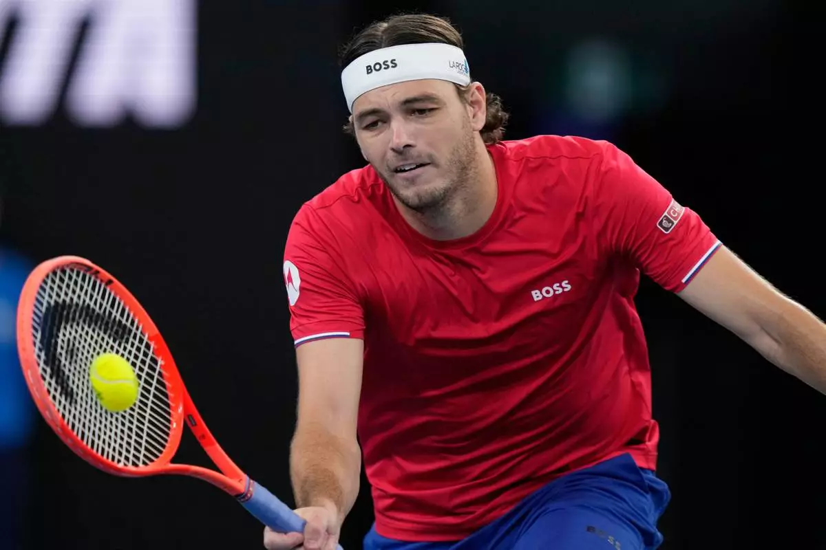 Taylor Fritz of the U.S. hits a forehand to Hubert Hurkacz of Poland during their semifinal match at the United Cup tennis tournament in Sydney, Saturday, Jan. 10, 2026. (AP Photo/Rick Rycroft)