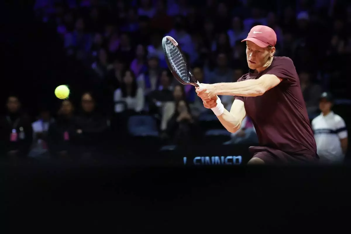 Italy's Jannik Sinner hits a backhand to Spain's Carlos Alcaraz during an exhibition tennis match in Incheon, South Korea, Saturday, Jan. 10, 2026. (Shin Jun-hee/Yonhap via AP)