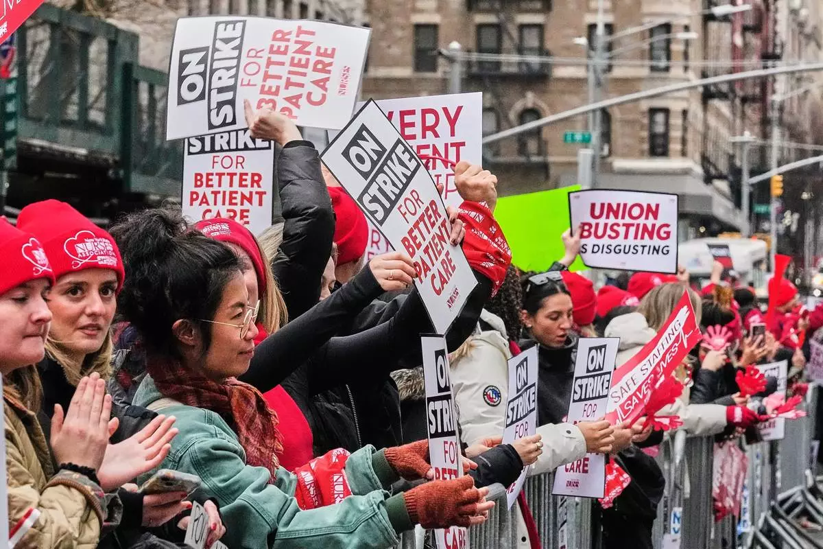 Striking nurses demonstrate outside Mt. Sinai Hospital, in New York, Wednesday, Jan. 14, 2026. (AP Photo/Richard Drew)
