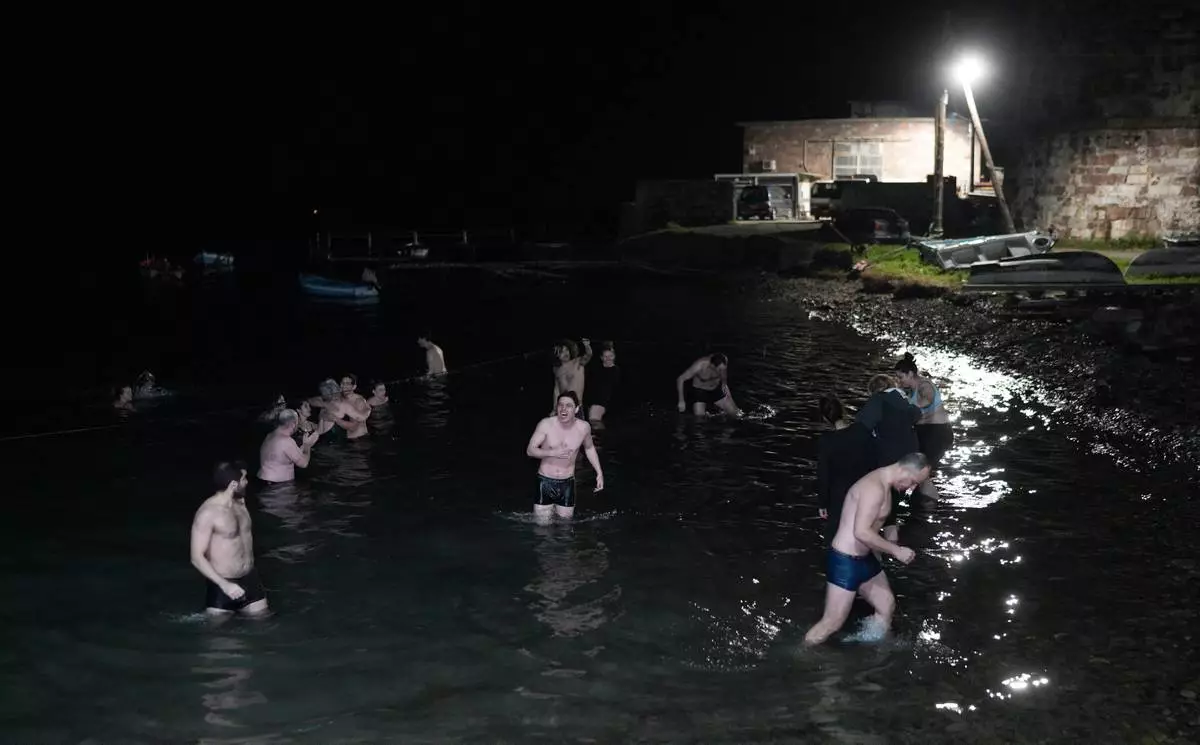 Rescue volunteers dive into the sea to celebrate after being acquitted of charges related to aiding migrants in Mytilene, on the northeastern Aegean island of Lesbos, Greece, Thursday, Jan. 15, 2026. (AP Photo/Panagiotis Balaskas)