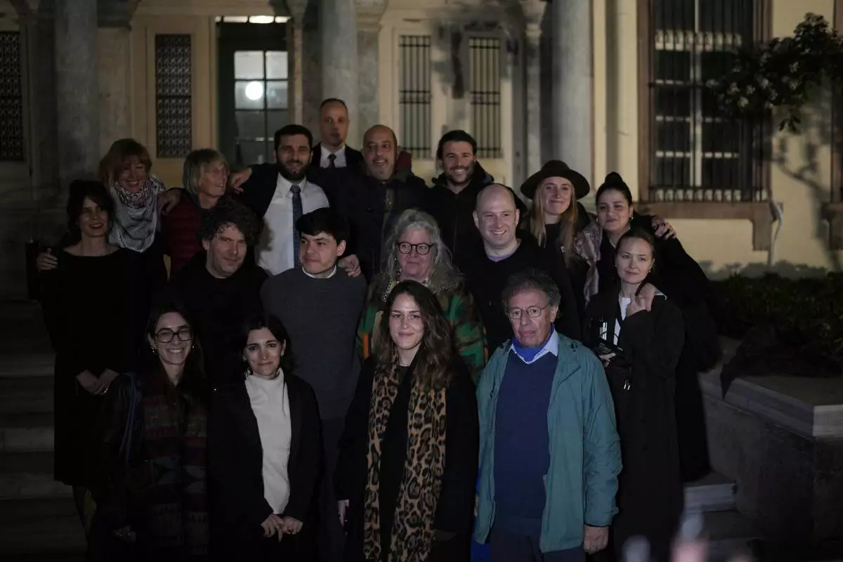 Rescue volunteers and their lawyer pose outside a courthouse in Mytilene, on the northeastern Aegean island of Lesbos, Greece, Thursday, Jan. 15, 2026, after being acquitted of charges related to aiding migrants. (AP Photo/Panagiotis Balaskas)