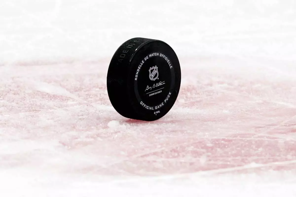 FILE - A hockey puck rests on the ice during the second period of an NHL hockey game Feb. 2, 2022, in Elmont, N.Y. (AP Photo/Adam Hunger, File)