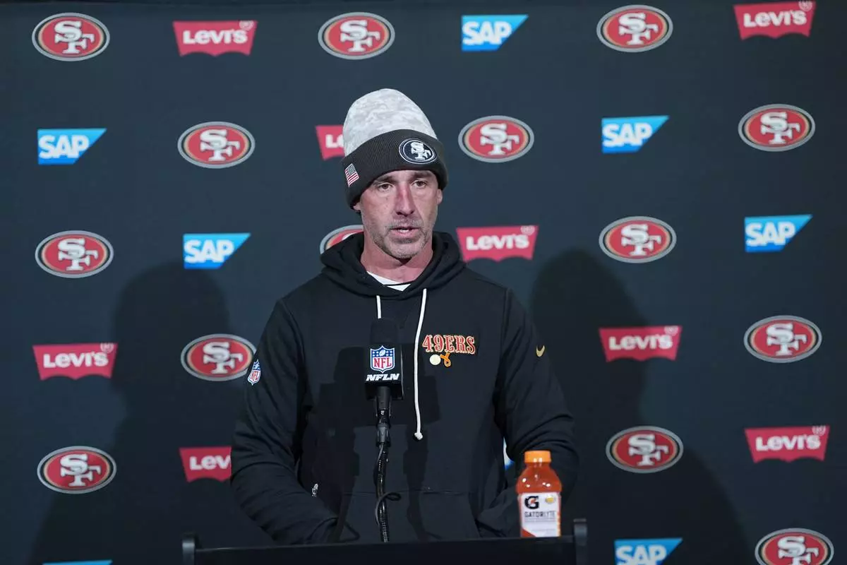 San Francisco 49ers head coach Kyle Shanahan talks during a news conference after an NFL wild-card playoff football game against the Philadelphia Eagles on Sunday, Jan. 11, 2026, in Philadelphia. (AP Photo/Matt Rourke)