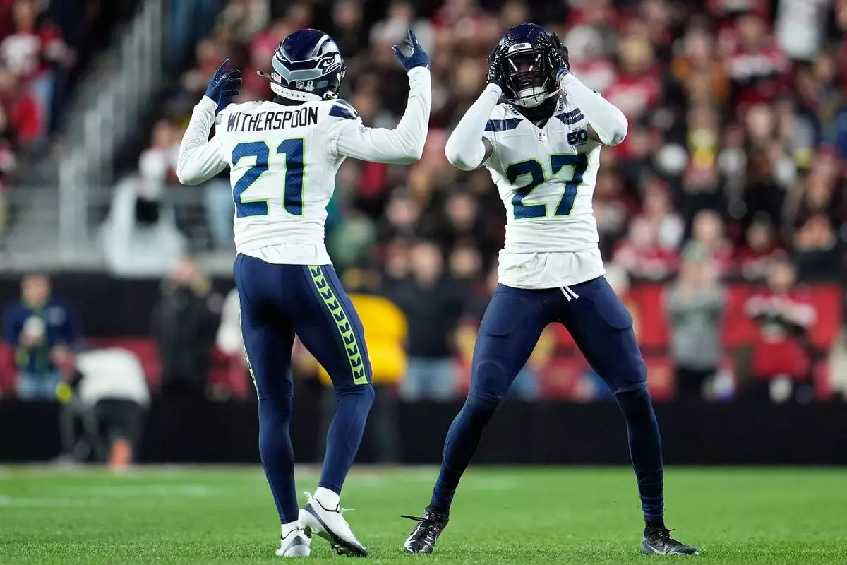 Seattle Seahawks cornerbacks Devon Witherspoon (21) and Riq Woolen (27) react after stopping the San Francisco 49ers on downs during the first half of an NFL football game in Santa Clara, Calif., Saturday, Jan. 3, 2026. (AP Photo/Godofredo A. Vásquez)