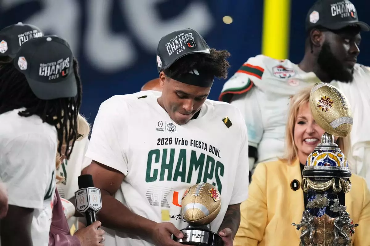 Miami defensive back Jakobe Thomas holds the defensive player of the game trophy after the Fiesta Bowl NCAA college football playoff semifinal game against Mississippi, Thursday, Jan. 8, 2026, in Glendale, Ariz. (AP Photo/Ross D. Franklin)
