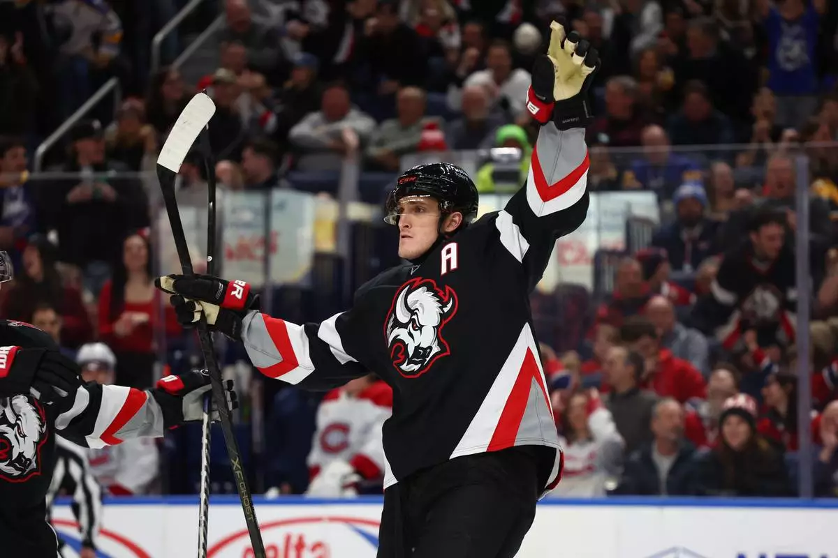 Buffalo Sabres center Tage Thompson celebrates his goal during the first period of an NHL hockey game against the Montreal Canadiens, Thursday, Jan. 15, 2026, in Buffalo, N.Y. (AP Photo/Jeffrey T. Barnes)