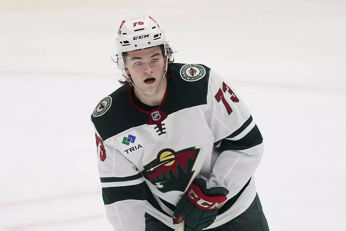 FILE - Minnesota Wild defenseman Kyle Masters handles the puck during a preseason NHL hockey game, Tuesday, Sept. 26, 2023, in Dallas. (AP Photo/Tony Gutierrez, File)