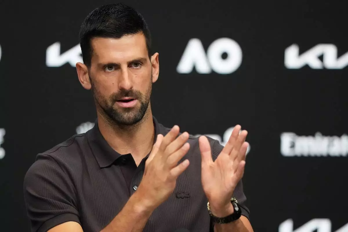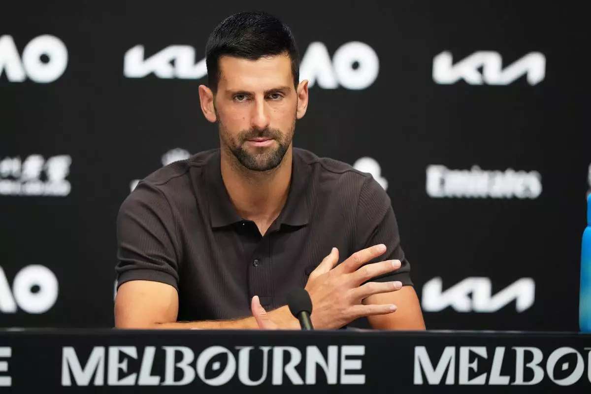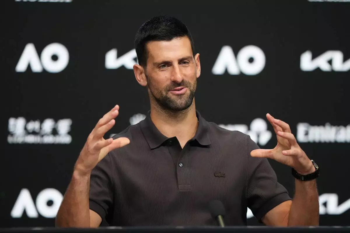 Novak Djokovic of Serbia gestures during a press conference ahead of the Australian Open tennis championship in Melbourne, Australia, Saturday, Jan. 17, 2026. (AP Photo/Aaron Favila)