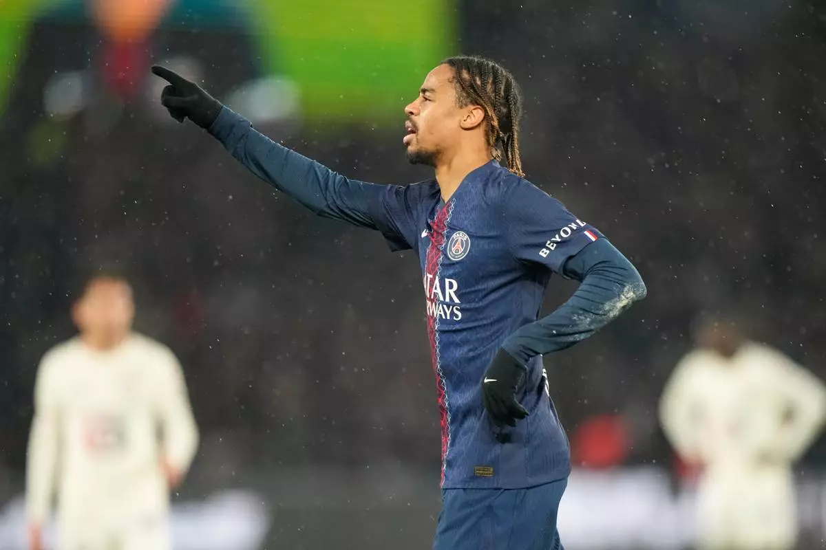 PSG's Bradley Barcola celebrates after scoring his side's third goal during the French League One soccer match between Paris Saint-Germain and Lille in Paris, France, Friday, Jan. 16, 2026. (AP Photo/Michel Euler)