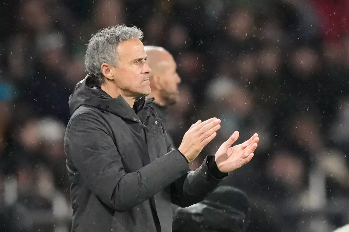 PSG's head coach Luis Enrique reacts during the French League One soccer match between Paris Saint-Germain and Lille in Paris, France, Friday, Jan. 16, 2026. (AP Photo/Michel Euler)