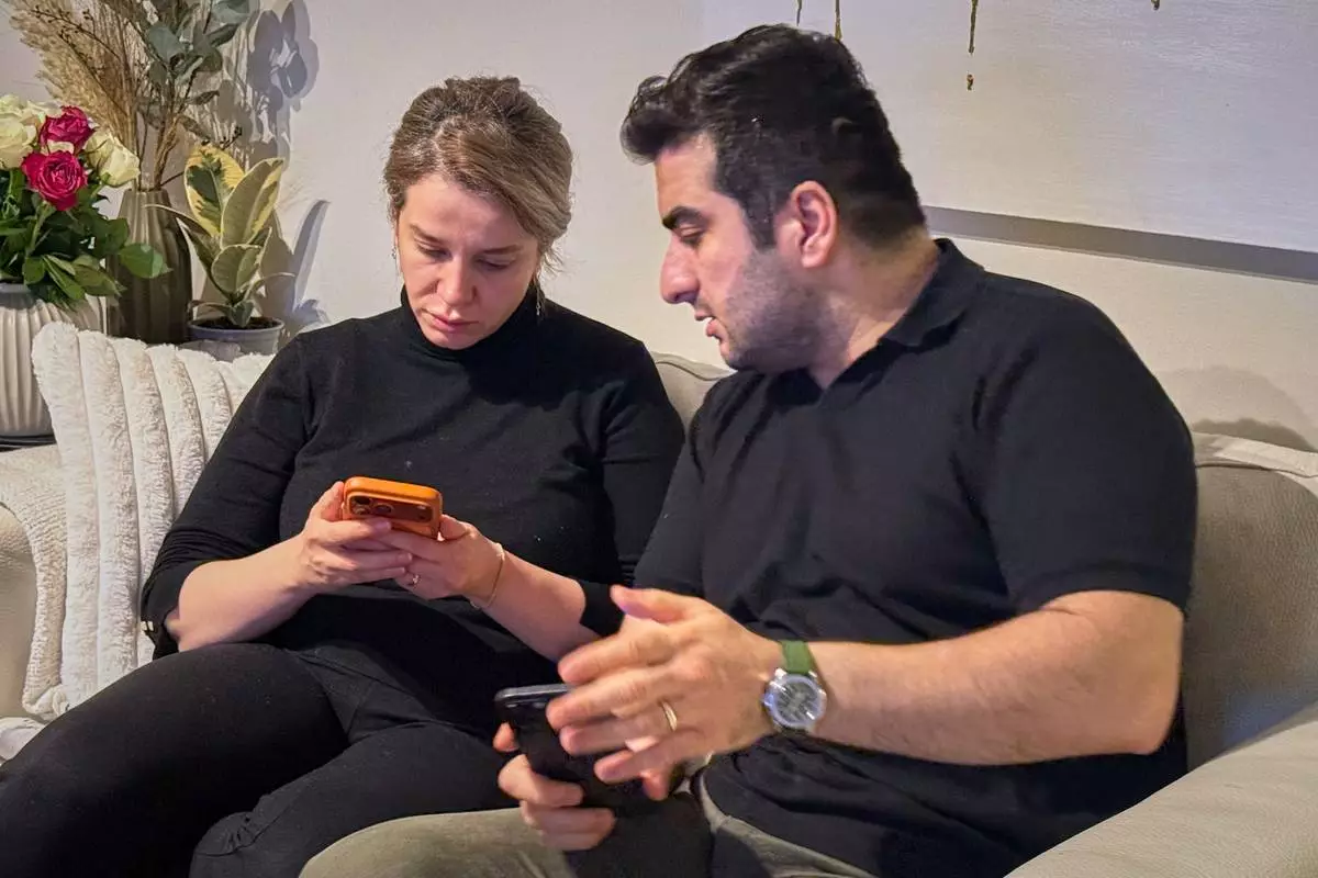 Hali Norei, left, and her partner Nezar Minoei look at pictures of Norei's 23-year-old niece Robina Aminian on a cellphone during an interview in Oslo, Norway, Wednesday, Jan. 14, 2025. Aminian, a university student, was killed during Iran's protests. (AP Photo/Bjornar Verpeide)
