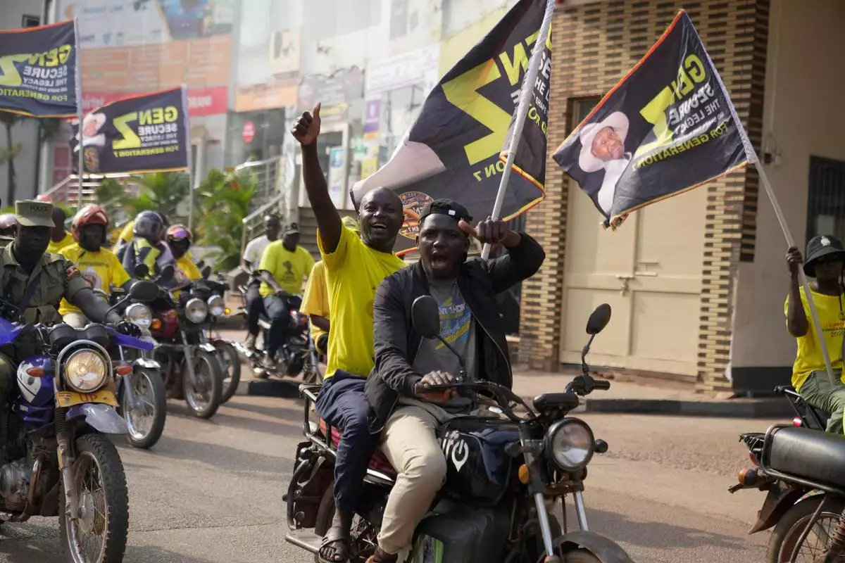Supporters of Ugandan President Yoweri Museveni celebrate his victory in the presidential election in Kampala, Uganda, Saturday, Jan. 17, 2026. (AP Photo/Brian Inganga)