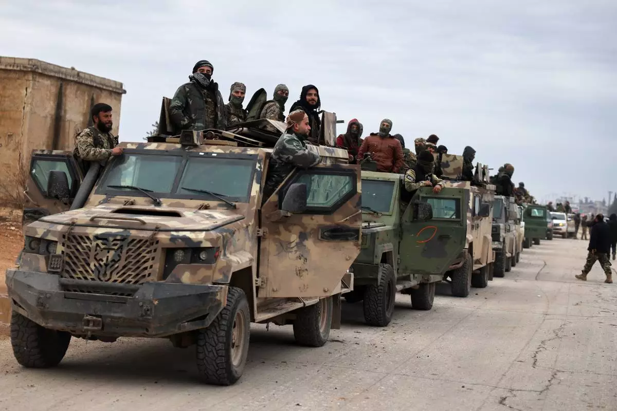 A convoy of Syrian government forces drive on a road leading to the town of Deir Hafer, Syria, Saturday, Jan. 17, 2026. (AP Photo/Ghaith Alsayed)