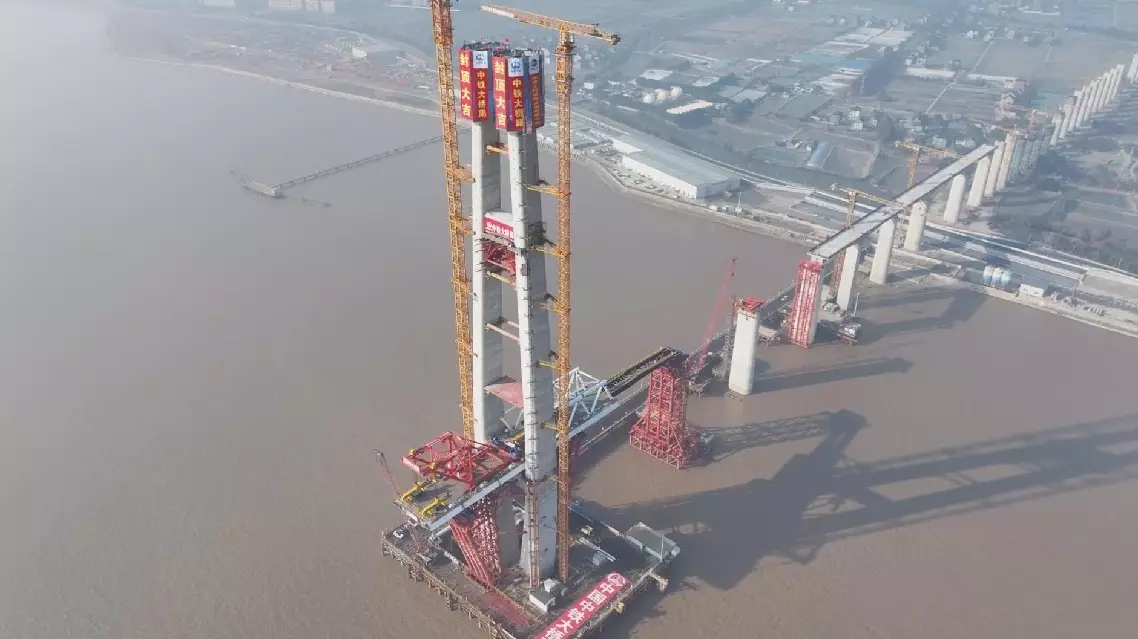 Stretching nearly 30 kilometers, the world's longest cross-sea high-speed railway bridge over Hangzhou Bay in eastern China reached a key milestone on Friday when its first main tower was topped out.