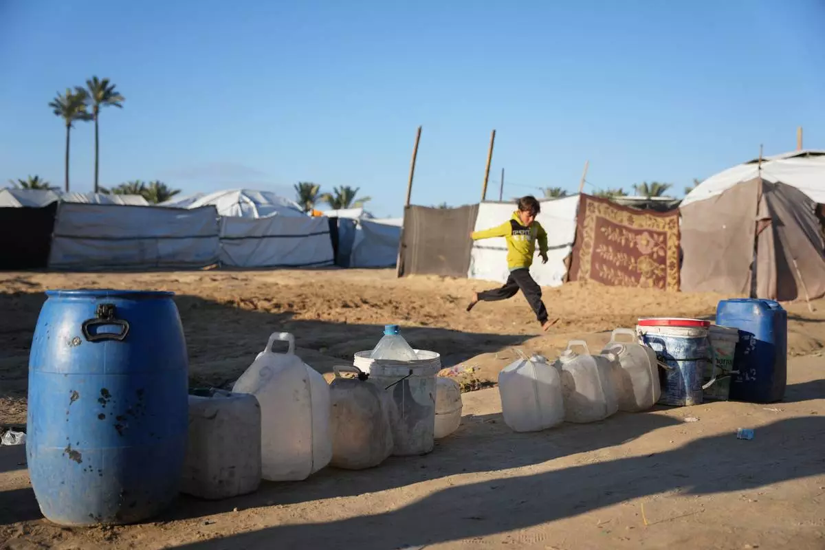 A displaced Palestinian boy runs past empty water barrels as residents wait for a drinking water delivery in Deir al-Balah, Gaza Strip, Saturday, Jan. 17, 2026. (AP Photo/Abdel Kareem Hana)