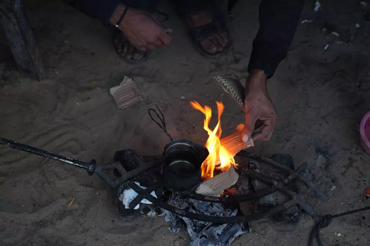 Displaced Palestinian Amr Al-Manaya, 35, sits by the fire with his children, next to their tent in Deir al-Balah, Gaza Strip, Saturday, Jan. 17, 2026. (AP Photo/Abdel Kareem Hana)