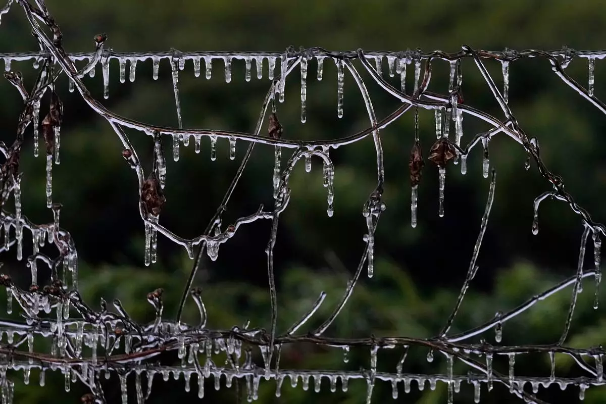 Icicles cling to some vines along a barbed wire fence at an ornamental plant business in sub-freezing temperatures Friday, Jan. 16, 2026, in Plant City, Fla. (AP Photo/Chris O'Meara)