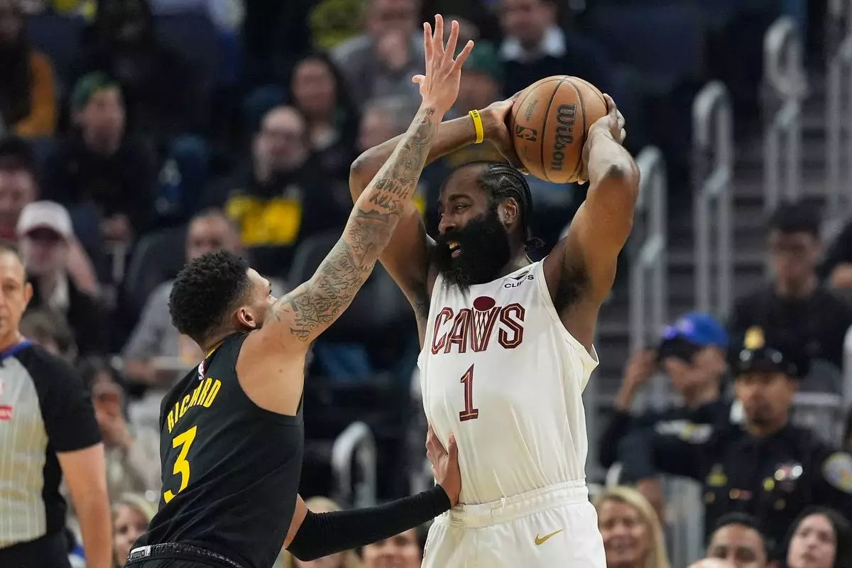 Cleveland Cavaliers guard James Harden (1) looks to pass the ball while being defended by Golden State Warriors guard Will Richard during the first half of an NBA basketball game in San Francisco, Thursday, April 2, 2026. (AP Photo/Jeff Chiu)