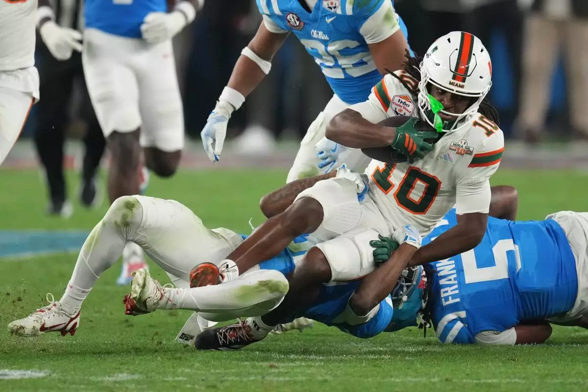Miami wide receiver Malachi Toney leaves the field after the Fiesta Bowl NCAA college football playoff semifinal game against Mississippi, Thursday, Jan. 8, 2026, in Glendale, Ariz. (AP Photo/Rick Scuteri)