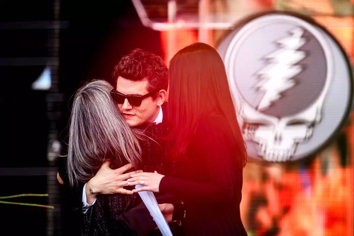 John Mayer embraces Natascha Münter during a public memorial for her husband, Grateful Dead guitarist Bob Weir, on Saturday, Jan. 17, 2026, in San Francisco. (AP Photo/Noah Berger)