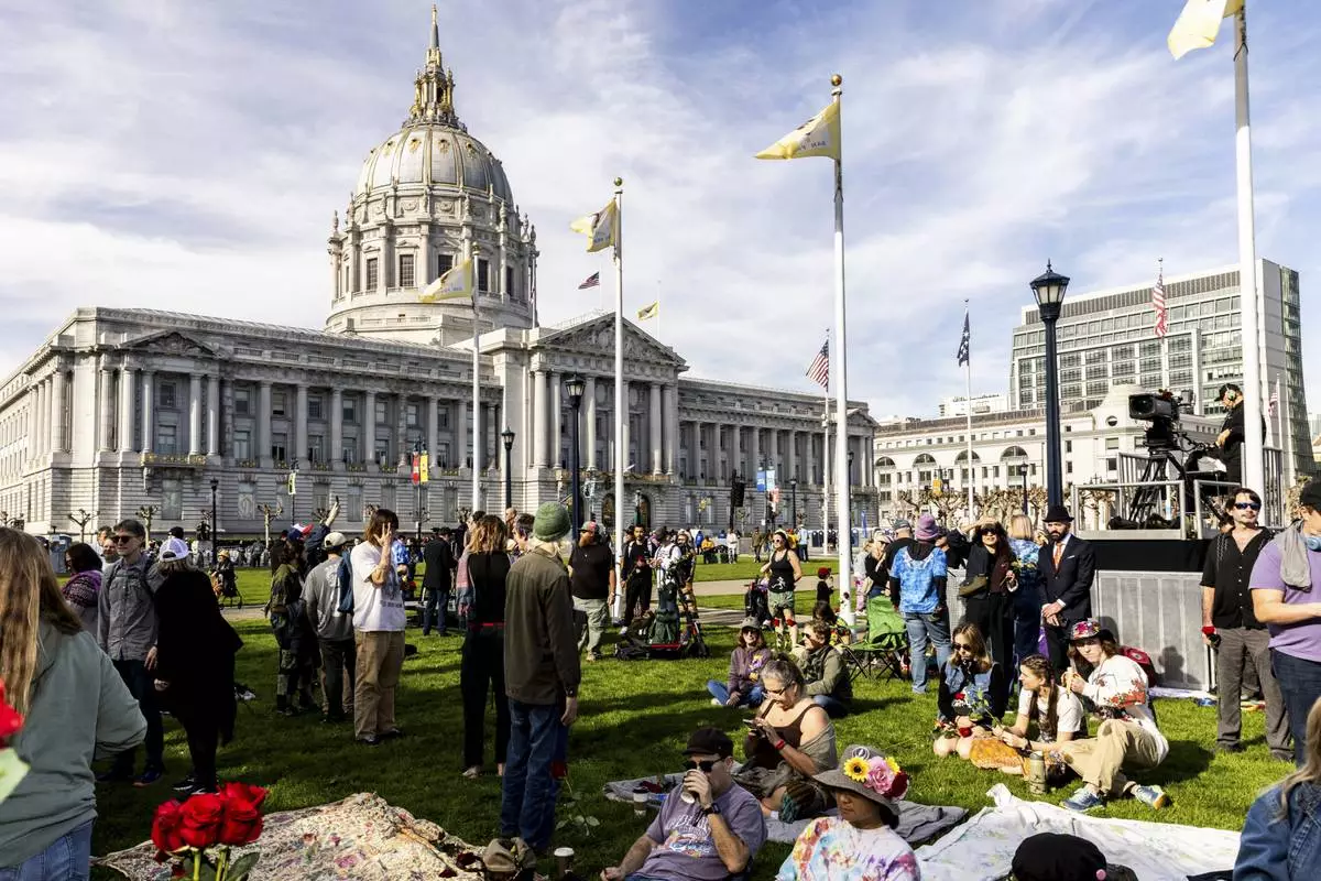 Attendees gather during a public memorial for Grateful Dead co-founder Bob Weir at Civic Center Plaza in San Francisco, Saturday, Jan. 17, 2026. (Stephen Lam/San Francisco Chronicle via AP)