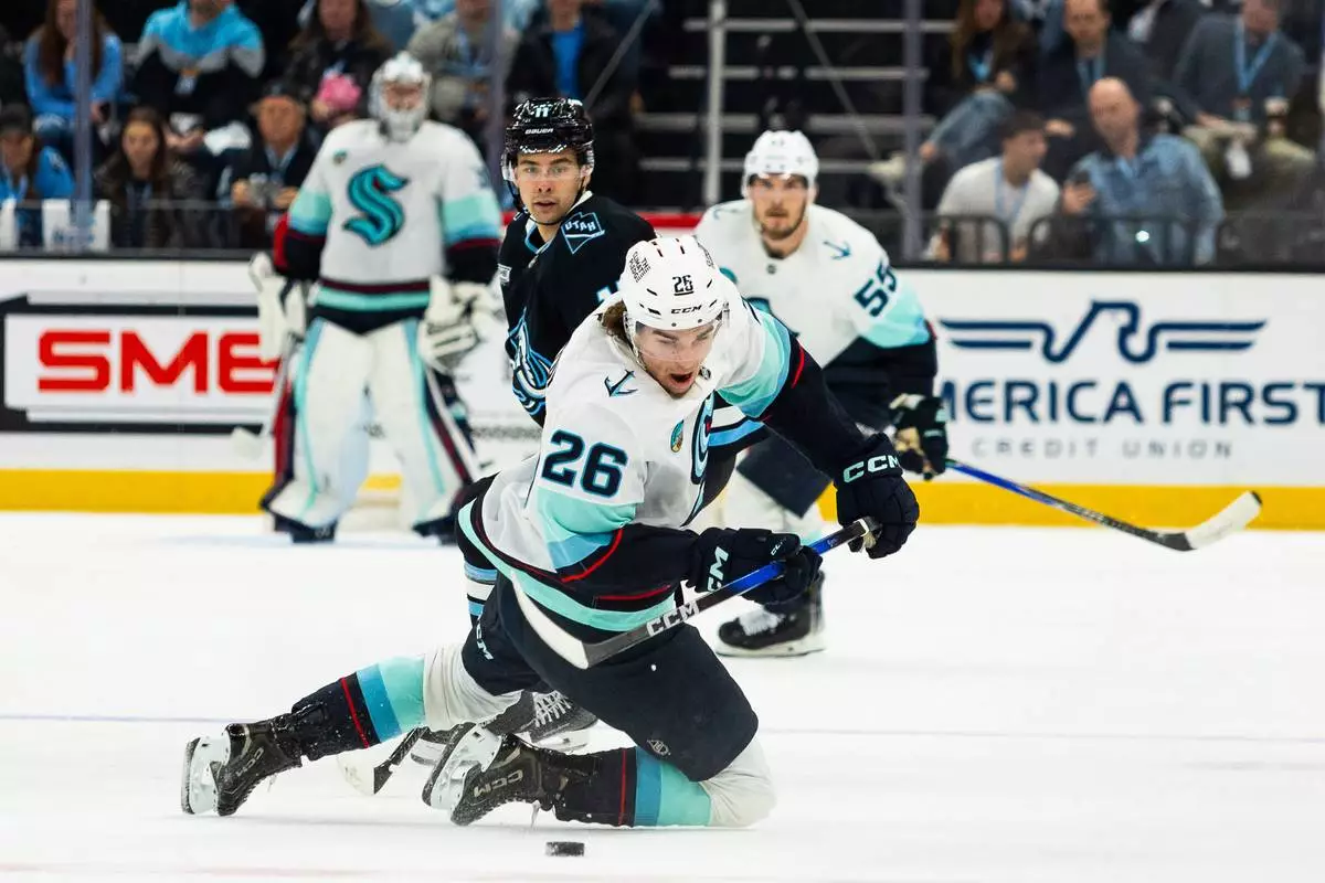 Seattle Kraken center Ryan Winterton (26) goes down after the puck against the Utah Mammoth during the second period of an NHL hockey game Saturday, Jan. 17, 2026, in Salt Lake City. (AP Photo/Melissa Majchrzak)