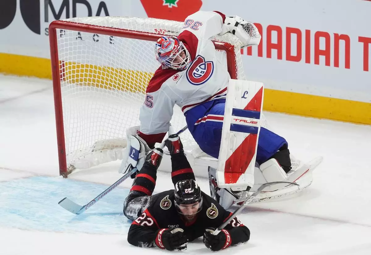 Montreal Canadiens goaltender Samuel Montembeault (35) grabs the net as Ottawa Senators right wing Michael Amadio (22) slides into him during the second period of an NHL hockey game, in Ottawa, Ontario, Saturday, Jan. 17, 2026. (Adrian Wyld/The Canadian Press via AP)