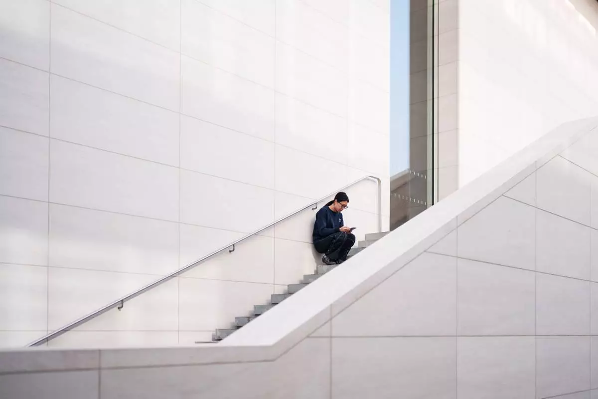 A woman checks phone sitting on a stairway outside a shopping mall in Beijing, China, Thursday, Jan. 15, 2026. (AP Photo/Vincent Thian)