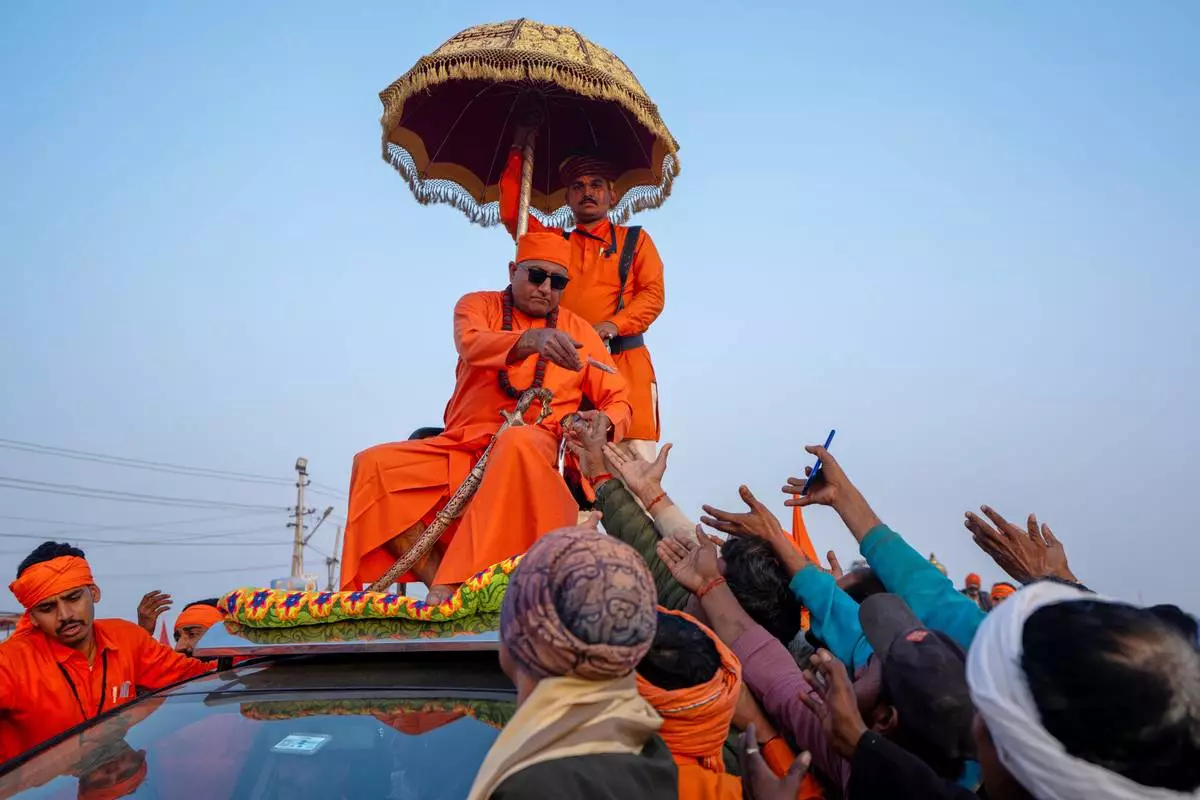 A Hindu holy man distributes food while sitting on the top of his vehicle on the eve of Mauni Amavasya, a divine occasion in Hindu religious practice followed for honoring ancestors or forefathers, at the Sangam, the confluence of the Ganges, the Yamuna and the mythical Saraswati rivers, during the annual month long Hindu religious fair "Magh Mela" in Prayagraj, India, Saturday, Jan.17, 2026. (AP Photo/Rajesh Kumar Singh)