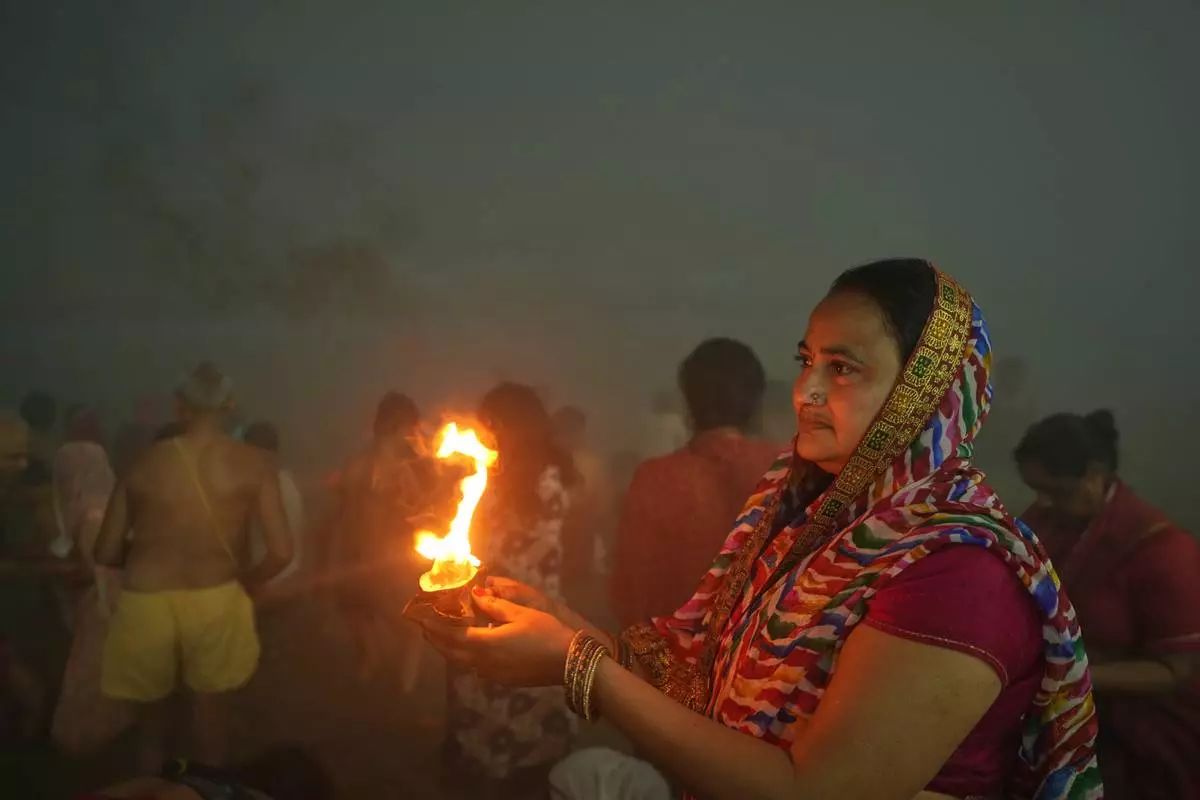 Hindu holy men pray on the eve of Mauni Amavasya, a divine occasion in Hindu religious practice followed for honoring ancestors or forefathers, at the Sangam, the confluence of the Ganges, the Yamuna and the mythical Saraswati rivers, during the annual month long Hindu religious fair "Magh Mela" in Prayagraj, India, Saturday, Jan.17, 2026. (AP Photo/Rajesh Kumar Singh)