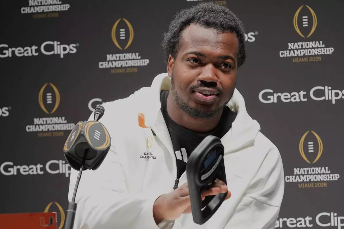 Miami defensive lineman Rueben Bain Jr. speaks during media day ahead of the College Football Playoff national championship game between Miami and Indiana, Saturday, Jan. 17, 2026, in Miami. (AP Photo/Marta Lavandier)