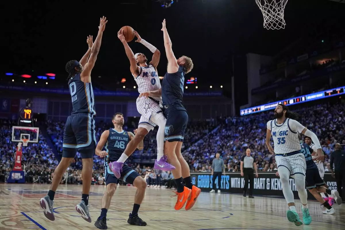 Orlando Magic guard Anthony Black (0) shoots as Memphis Grizzlies forward Jaylen Wells (0) and Memphis Grizzlies center Jock Landale (31) decent as Orlando Magic center Goga Bitadze (35) movs in during the first half of NBA basketball game Sunday, Jan. 18, 2026, in London. (AP Photo/Kin Cheung)
