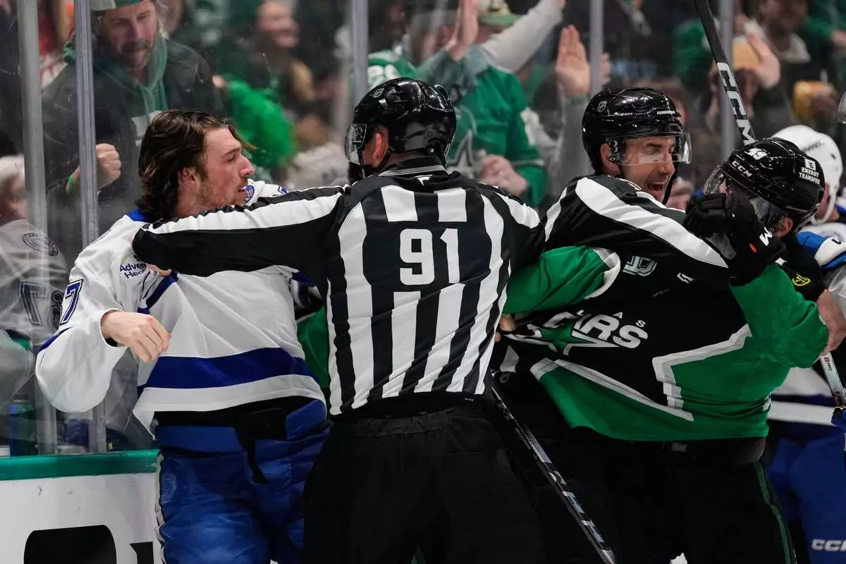 Tampa Bay Lightning defenseman Declan Carlile, left, is held back by linesman Ben O'Quinn (91) as Carlile and Dallas Stars' Justin Hryckowian, right, fight in the first period of an NHL hockey game in Dallas, Sunday, Jan. 18, 2026. (AP Photo/Tony Gutierrez)