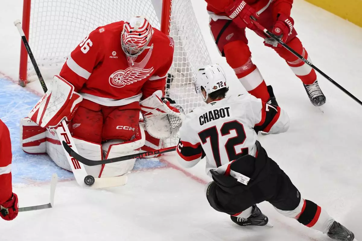 Ottawa Senators defenseman Thomas Chabot (72) tries to score on Detroit Red Wings goaltender John Gibson (36) after skating past Detroit Red Wings left wing James van Riemsdyk (21) in the first period of an NHL hockey game, Sunday, Jan. 18, 2026, in Detroit. (AP Photo/Lon Horwedel)